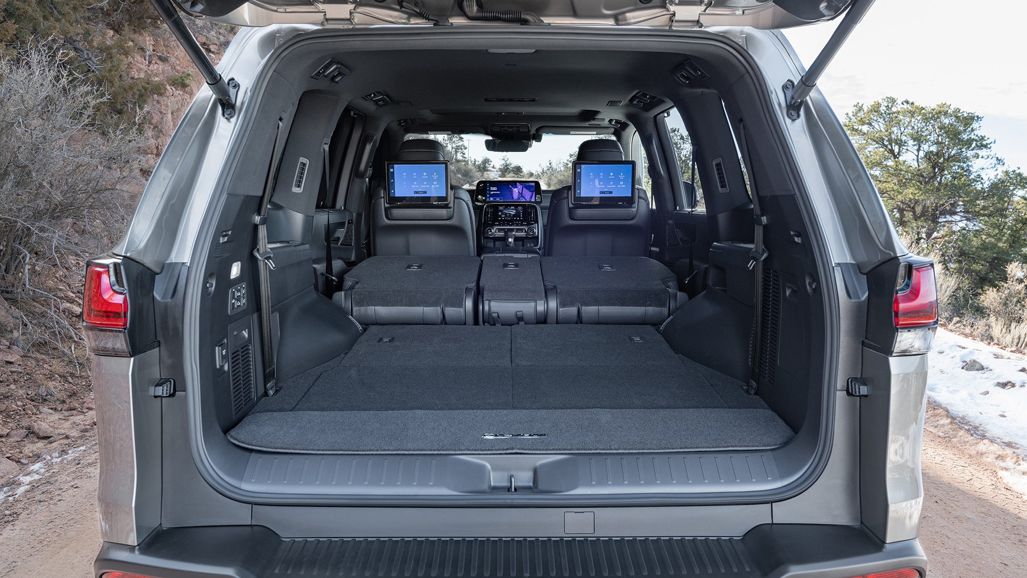 Speaking of best-in-class interior amenities, the optional ($2,600 on F-Sport, standard on Ultra Luxury) 25-speaker Mark Levinson sound system offers an aural assault like few other setups on the market. You'll hear things you've never heard before from songs you've listened to 100 times. The LX's new 12.3-inch infotainment touchscreen is a huge upgrade from previous Lexus LX SUVs (no more touchpad, hooray!), though the 7.0-inch screen below seems to be a bit of an afterthought, with a limited amount of information that likely could have been just part of the main setup. (I would have liked to have seen a single screen like what Lexus unveiled in the new NX.) Space in the center console is copious, as are the power/USB ports, and I had plenty of space to throw snacks, sunglasses, and phones. You can also option a cooler compartment if you desire.