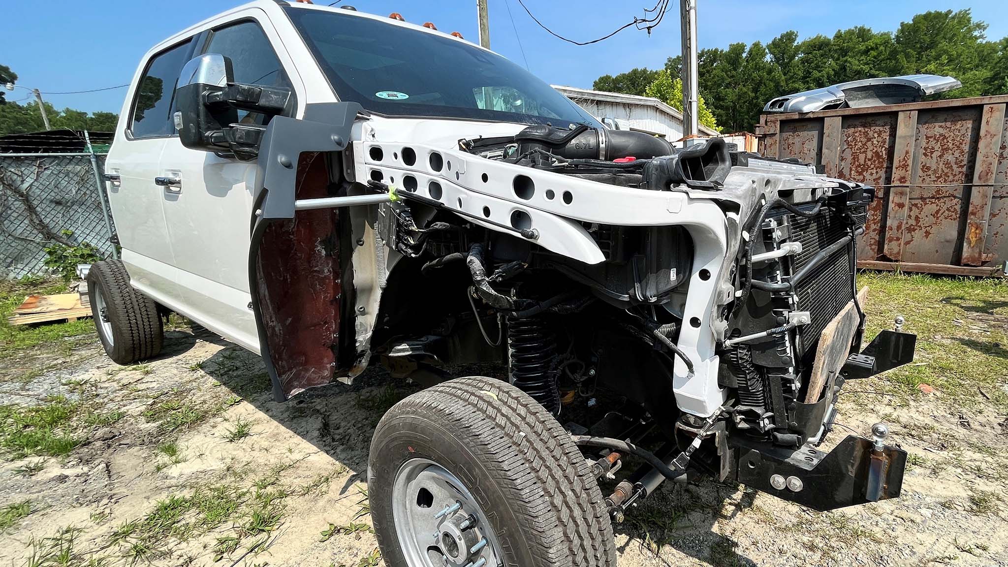 To give you a little perspective right away, early in the test drive we parked the MegaRexx MegaRaptor directly behind a Ford F-250 Super Duty, the truck from which it originates, sort of—the small caveat is that the example is a 2023 longbed model. MegaRaptors are currently founded from 2022 short-bed Lariat rigs, but the custom unit essentially is built using a bone-stock crew-cab Super Duty with four-wheel drive.