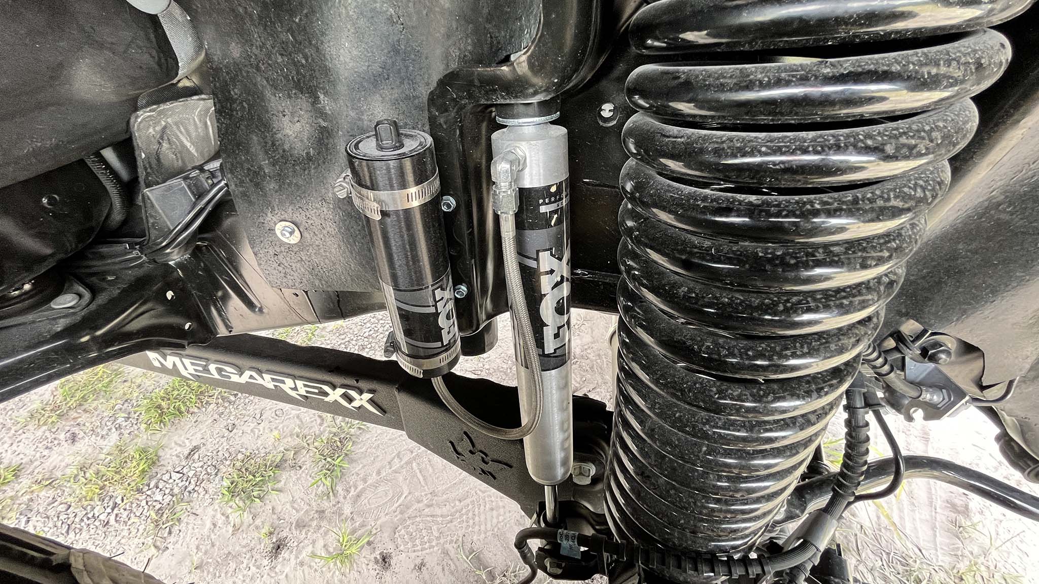 Suspension upgrades are the major mechanical changes that MegaRexx makes on each MegaRaptor. Starting with 4.5-inch Carli Suspension full-progressive front coil springs and Fox Backcountry 2.0 reservoir shocks, the front side also includes MegaRexx's proprietary stronger and longer radius arms, Icon dual steering stabilizers, and an Icon adjustable track bar.