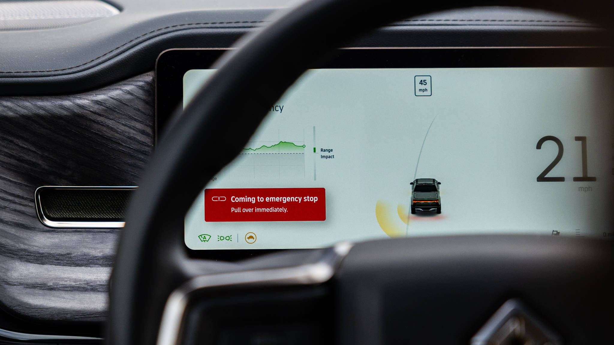 But then itstilldidn't quit. Top speed was down to 9 mph, but we were still driving circles around the neighborhood. At one point, we even made a three-point turn at the end of an unfinished road. The truck just kept going, until finally our speed dropped to less than 5 mph. At 2 mph we decided to stop where we knew we wouldn't be blocking the lane or a driveway. At that point, the truck refused to move again and after a minute or so threw a brief "system fault" warning and put itself in park.