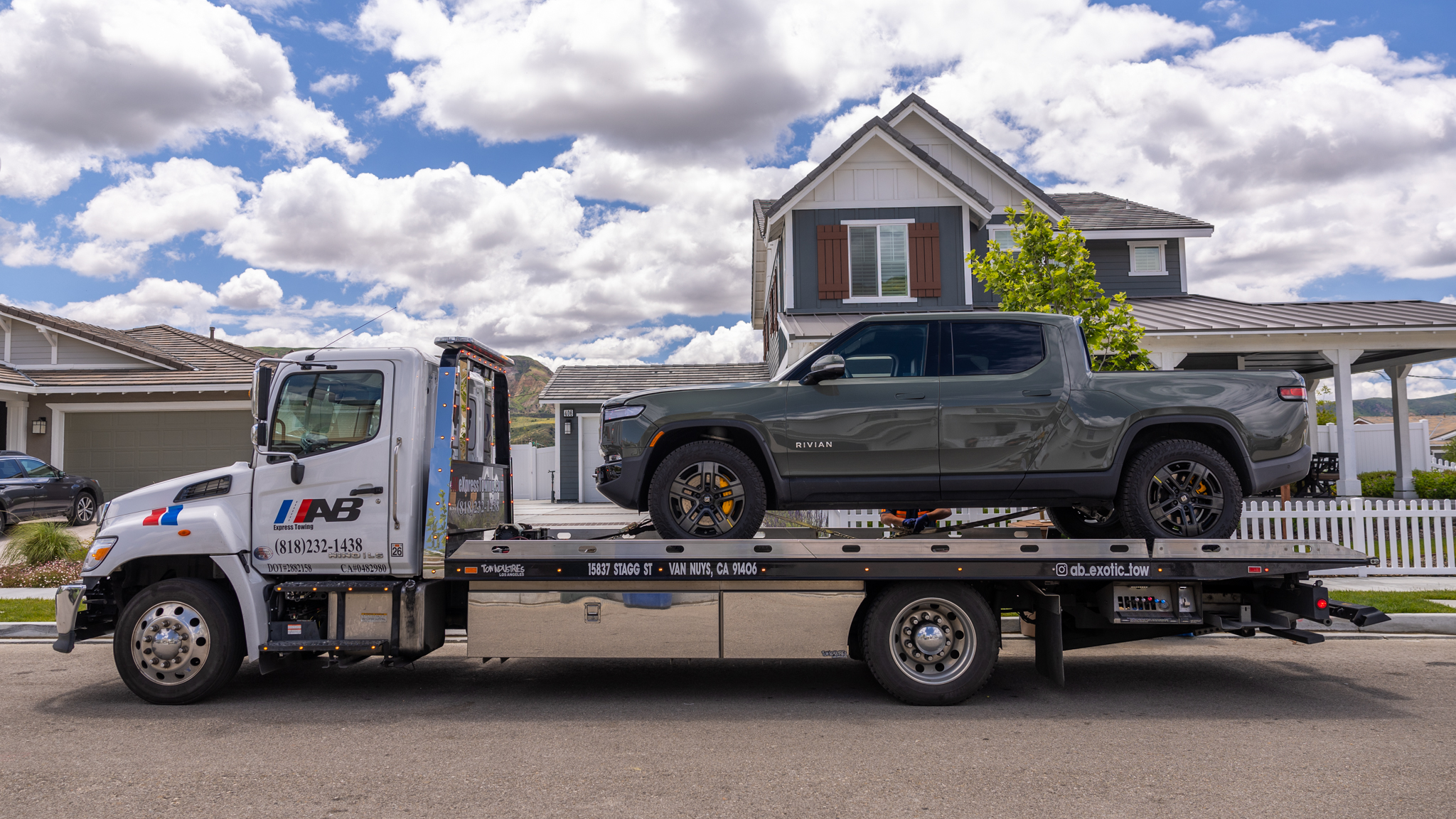 Just over an hour and a half after the truck died, Louie Cejo pulled up in the AB Exotic Towing flatbed to save the day. Unfortunately, our 12-volt batteries were so dead that his jump box couldn't get the truck to power up reliably (screens kept starting up then going blank again and starting over), but not to worry, Cejo said he tows at least two EVs a week. He had a plan.