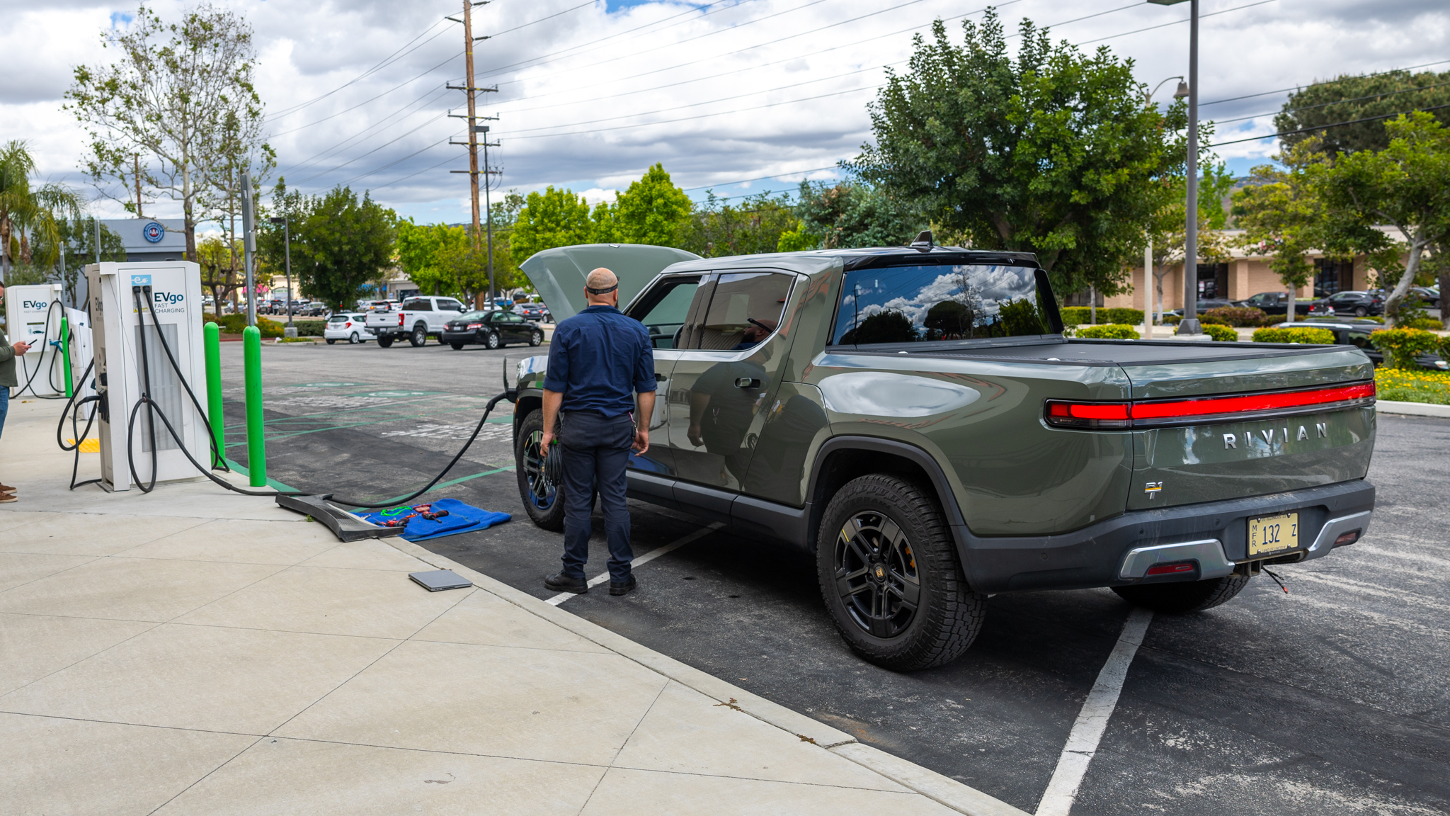 With everything powered back up, we were ready to charge when our turn came. Or, we would have been, had the charger we dropped the truck next to been working reliably. It conked out on the person before us and refused to start a charge at all for the R1T. We tried calling EVGo customer service, but they couldn't fix it remotely. Luckily, the other charger had opened up at that point, so we pushed the truck 30 feet to that one. Naturally, it wouldn't connect, either. We even tried it on the technician's truck, and no dice.