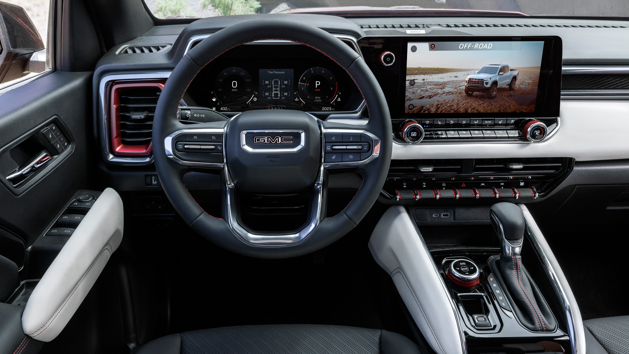 GMC similarly democratizes a digital gauge cluster and new 11.3-inch touchscreen across all trims, though the Elevation and AT4 get a smaller 8.0-inch driver display that's more or less square, compared to the wider-format 11.0-inch unit on the rest of the Canyon lineup. We dug the new screen's sharp fonts and graphics, and the central touchscreen in particular is generally intuitive, though there is a lot you can do on it, including spinning a virtual copy of your truck around and fiddling with different settings via little hovering buttons all over it.