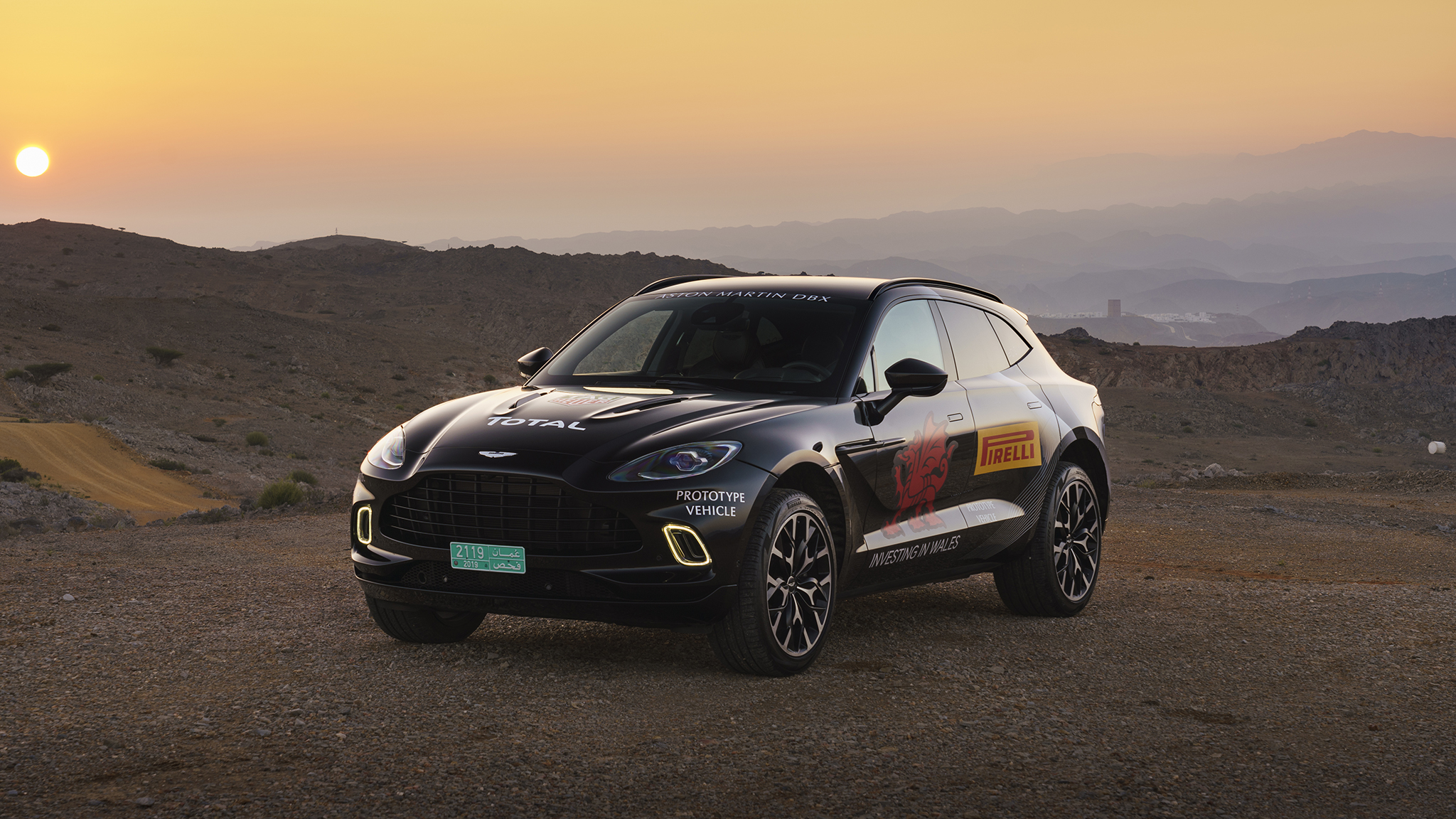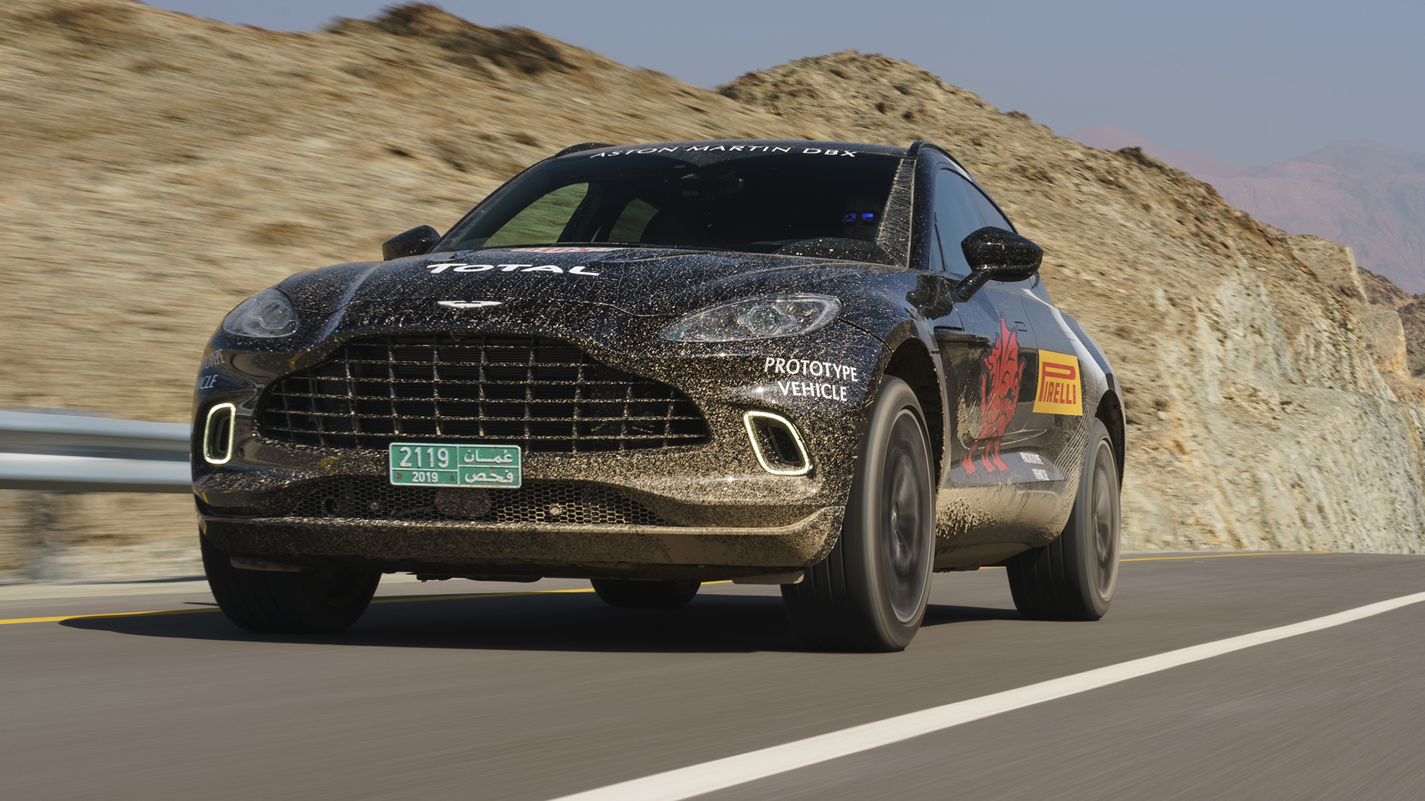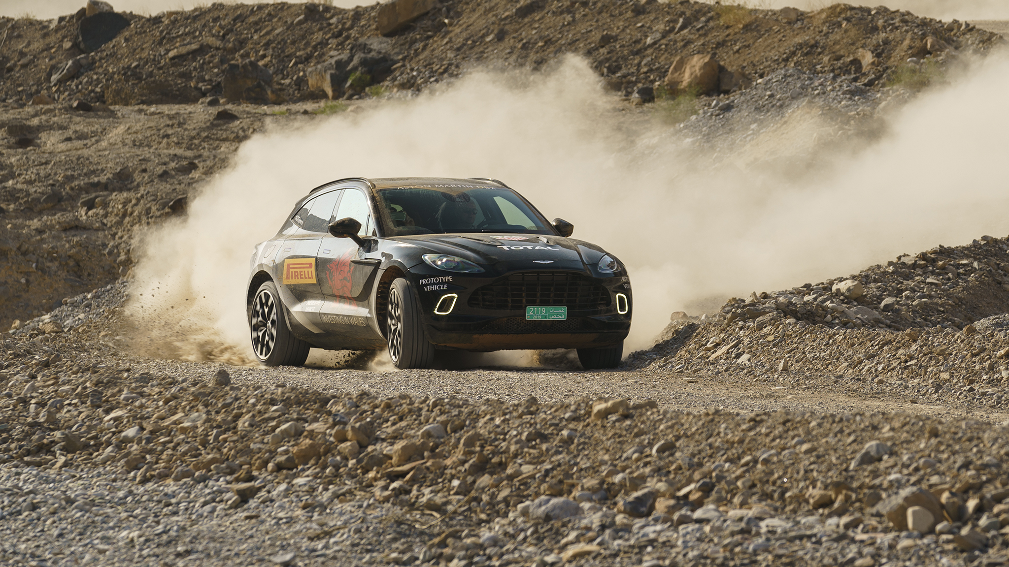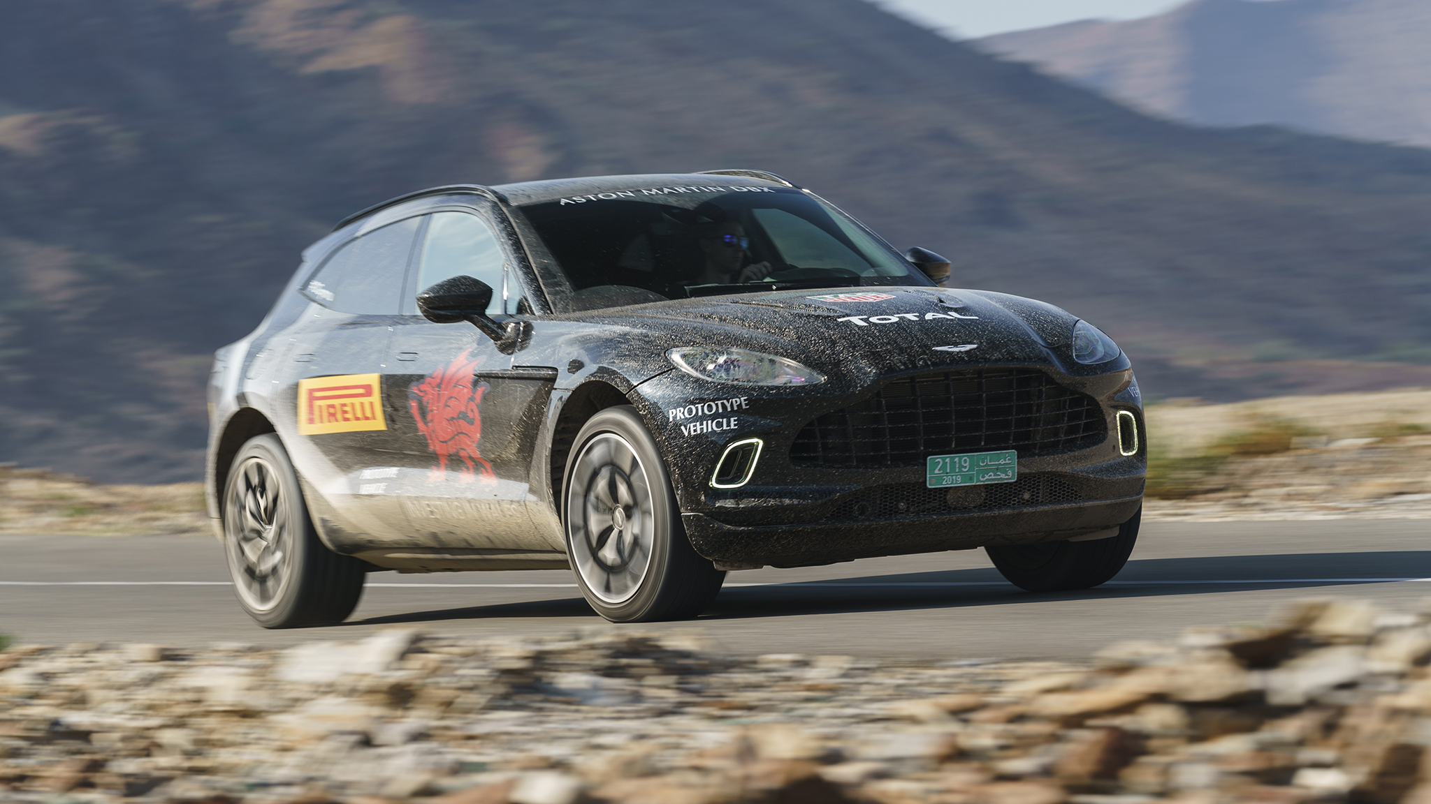 We're dancing an Aston Martin DBX prototype through the dramatic desert wilderness of Oman, on the southeastern coast of the Arabian Peninsula. And it feels right at home.